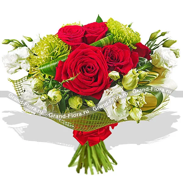ДЕЛЮКС: роза красная - 19 шт, хризантема одноголовая зеленая - 12 шт, эустома белая - 10 шт, лист аспидистры загнутый - 8 шт, сетка зеленая. Примерный размер: 45Х45 см.