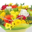 (на фото): роза красная - 3 шт., роза белая - 3 шт., гербера оранжевая/красная - 3 шт., кустовая роза желтая/кремовая - 2 шт., хризантема кустовая желтая - 2 шт., декоративная зелень, упаковка