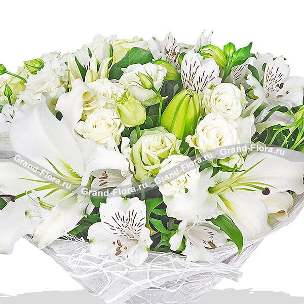 Воплощенная нежность и изящность букета, не может остаться незамеченной. Словно белое платье невесты, букет завораживает нежностью и невинностью.  Наполненный альстромериями, лилиями, эустомами и розами кристально – белых оттенков, он дарит ощущение невесомости и свободы, которое остается в глубине самого сердца.