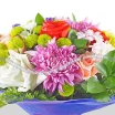 Уменьшенный: роза розовая - 1 шт., роза белая - 1 шт., роза красная - 3 шт., хризантема одноголовая белая - 1 шт., хризантема одноголовая зеленая (шамрок) - 1 шт., хризантема одноголовая фиолетовая - 1 шт., хризантема кустовая зеленая (сантини) - 1 шт., хризантема кустовая розовая - 1 шт., статица - 1 шт., декоративная зелень, фетр фиолетовый, + коробка конфет в подарок.