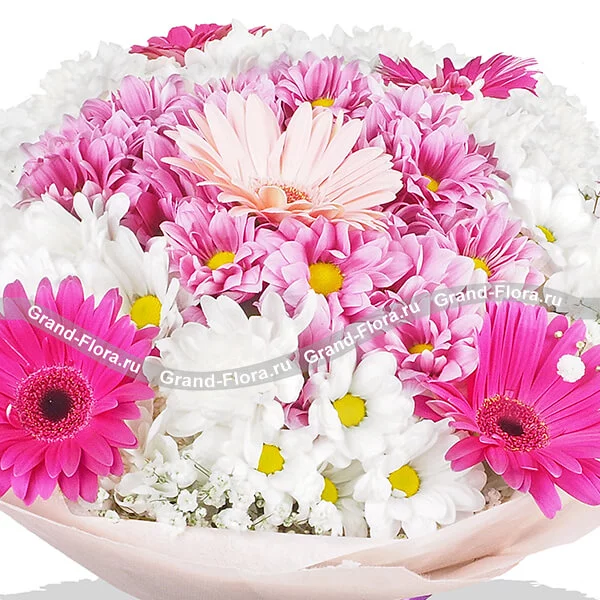 ДЕЛЮКС: гербера малиновая - 5 шт., гербера розовая - 4 шт., хризантема белая кустовая - 4 шт., хризантема розовая кустовая - 4 шт., гипсофила - 5 шт., фетр розовый, бант фиолетовый.