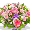 Уменьшенный: роза розовая - 3 шт, роза кустовая розовая - 1 шт, роза кустовая белая - 1 шт, фрезия(альстромерия) фиолетовая - 1 шт, фрезия(альстромерия) белая - 1 шт, эустома белая - 1 шт, декоративная зелень, фетр фиолетовый. Примерный размер: 20Х20 см.