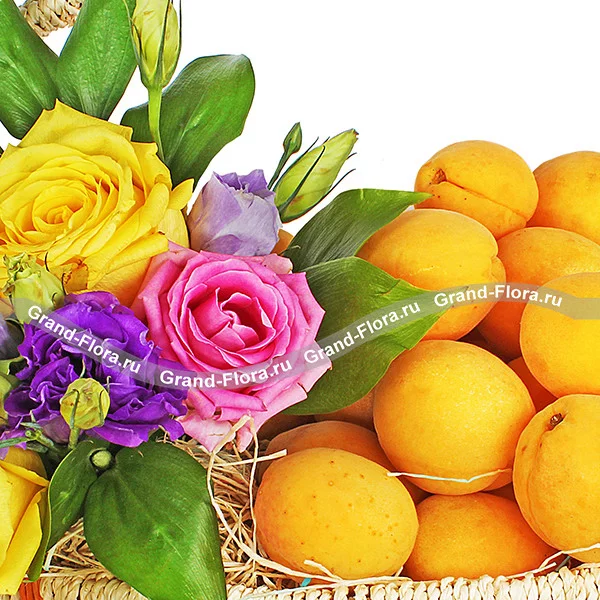 Стандартный: роза желтая - 3 шт., роза розовая - 2 шт., эустома фиолетовая - 1 шт., рускус - 2 шт., оазис, корзина средняя, абрикосы - 1,5 кг.