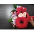 Уменьшенный: Гербера красная/малиновая/розовая микс - 3 шт., хризантема белая кустовая - 1 шт., роза кустовая кремовая - 1 шт., салал - 2 шт., фетр красный.