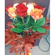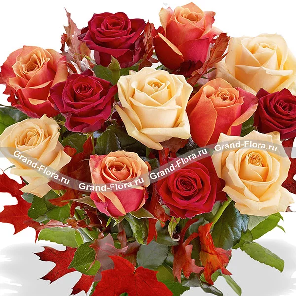 Выигрышное сочетание роз трех оттенков – нежного кремового, страстного красного и пленительного оранжевого – поможет выразить чувство благодарности и уважения. Дополненный осенними листьями букет не оставит равнодушной его получательницу