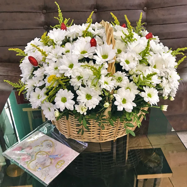 Композиция из очаровательных белых ромашек, дополненная солидаго и выразительными декоративными красными сердечками наверняка запомнится получательнице своей наивной простотой. Яркая и нежная композиция проложит путь к сердцу интересующей Вас девушки. Букет в корзине поможет выразить любовь к маме в день ее рождения и к девушке в годовщину отношений.