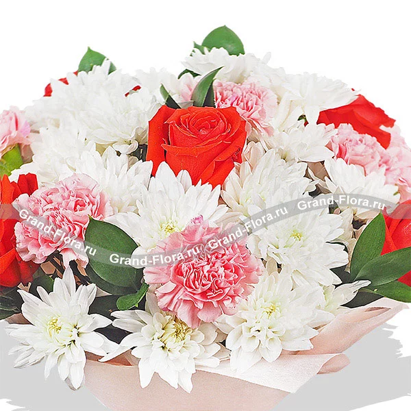 Роза красная - 15 шт., гвоздика розовая - 16 шт., хризантема кустовая белая - 10 шт., рускус, фетр розовый.
