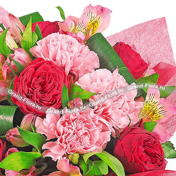 Роза красная - 15 шт, гвоздика розовая - 18 шт, альстромерия розовая - 14 шт, лист аспидистры загнутый - 9 шт, фетр красный.