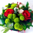 Уменьшенный: роза красная - 2 шт., роза кустовая белая - 1шт., хризантема кустовая зелёная - 1 шт., аспидистра - 1 шт., эвкалипт - 1 шт., салал - 2 шт., гиперикум - 1 шт., упаковка крафт, лента. Примерный размер: 20Х20 см.