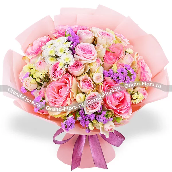 Люкс: роза розовая - 6 шт., роза кустовая розовая - 4 шт., хризантема сантини - 5 шт., статица фиолетовая, статица желтая, упаковка, лента. Примерный размер: 40Х40 см.