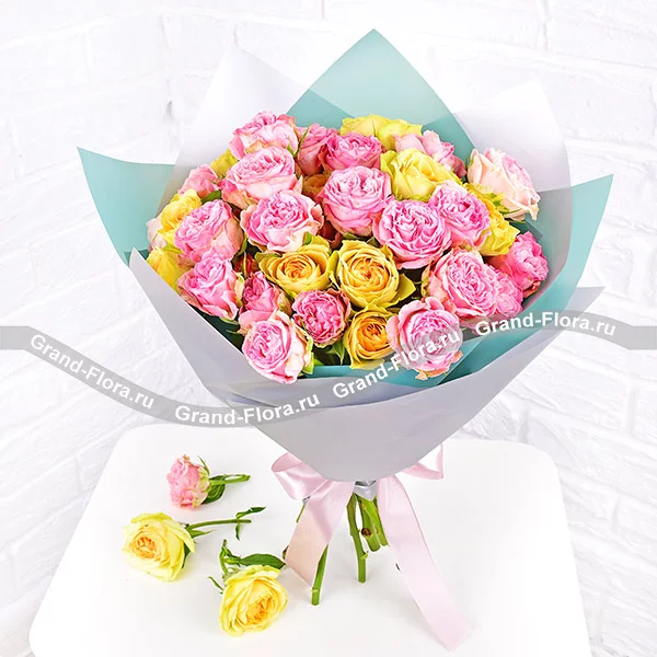 Стандартный: роза кустовая розовая - 5 шт, роза кустовая желтая - 4 шт, упаковка, лента розовая. Примерный размер: 35Х35 см.