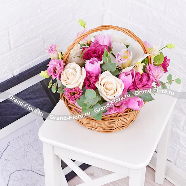 Стандартный: роза белая - 4 шт., тюльпан розовый - 5 шт., эустома розовая - 5 шт., орхидея белая - 1 шт., эвкалипт, оазис, корзина.