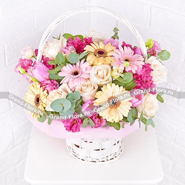 Уменьшенный: роза белая - 4 шт., гербера розовая - 1 шт., гербера желтая - 2 шт., тюльпан розовый - 4 шт., эустома розовая - 4 шт., эвкалипт, оазис, корзина. Примерный размер: 20Х20 см.