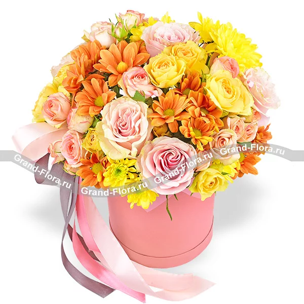 роза розовая - 6 шт., хризантема кустовая оранжевая - 3 шт., хризантема кустовая желтая - 3 шт., роза кустовая розовая - 3 шт., роза кустовая желтая - 2 шт., оазис, коробка, лента. Примерный размер: 25Х30 см.