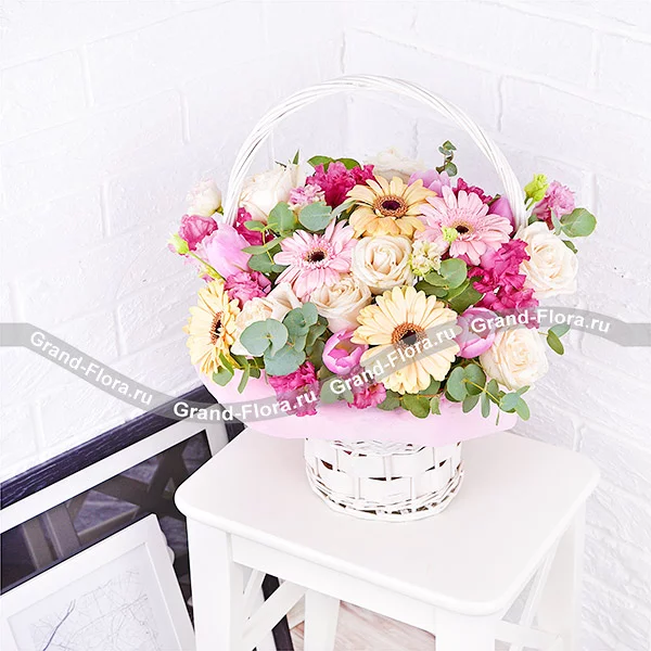 Стандартный: роза белая - 4 шт., гербера розовая - 1 шт., гербера желтая - 2 шт., тюльпан розовый - 3 шт., эустома розовая - 3 шт., эвкалипт, оазис, корзина. Примерный размер: 25Х30 см.