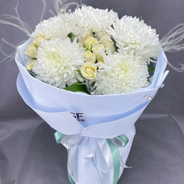 Элегантный букет из белых хризантем и роз- это классическое, но в то же время современное цветочное произведение, которое никогда не потеряет своей актуальности и всегда будет радовать изысканной и такой нежной красотой.